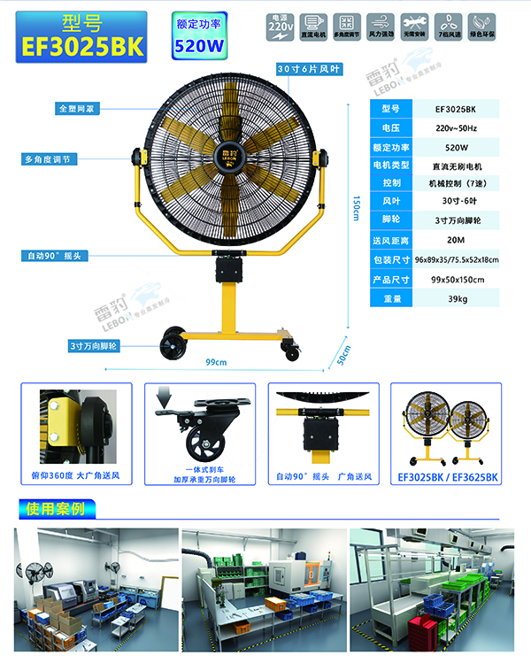 雷豹 EF3025BK 移动大风扇广泛适用于机械加工车间、物流仓储中心、大型商超、户外展会等多种场景,为用户提供高效的通风降温解决方案。