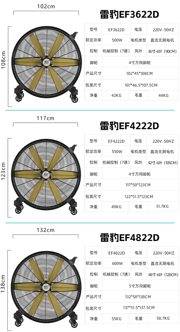 案例2:户外厂区、露天作业区、室外广场等开放式场所,夏季高温暴晒易形成闷热环境,某饭店户外等待区就面临此类难题 —— 传统降温设备送风范围有限,大面积区域无法实现有效降温,甚至因高温导致顾客流失。经多方对比,该饭店最终选用雷豹 EF4222D 工业大风扇作为室外通风降温主力设备。这款风扇适配户外复杂环境,机身稳固、运行稳定,无需频繁维护,使用寿命长;同时风量超大、送风范围广,搭配万向轮实现即插即用、移动灵活,可根据需求灵活布置在等待区、通道等不同位置,实现多方位通风降温覆盖。设备投入使用后,饭店户外等待区空气流通大幅改善,体感温度显著下降,闷热问题彻底解决。饭店老板表示:“设备用上之后,户外等待区的空气流通好了很多,体感也凉爽了不少,之前因为太热很多顾客不愿等待,流失了不少客源,现在终于没有这个烦恼了。”如需了解更多产品信息与合作案例,可访问雷豹官方网站:http://www.lebon-fan.com/