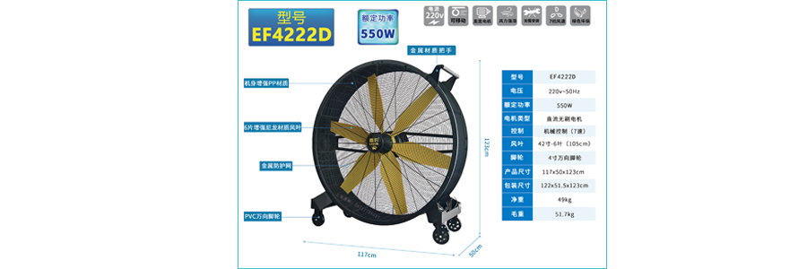 550w 直流无刷电机 42寸-6叶(105cm) 4寸万向脚轮 117×50×123cm 49kg